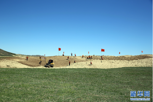 5月15日,工人在克什克腾旗境内的浑善达克沙地南缘扎沙障、种苗木。新华网石毅 摄