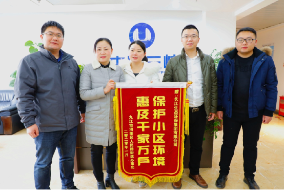 湖滨小区改造完成后,九江浔阳区人民路街道办事处赠送锦旗(左一为白玉良)